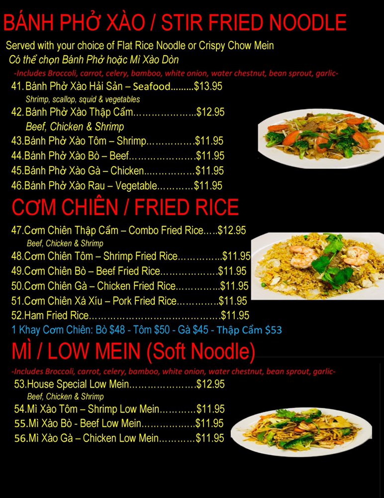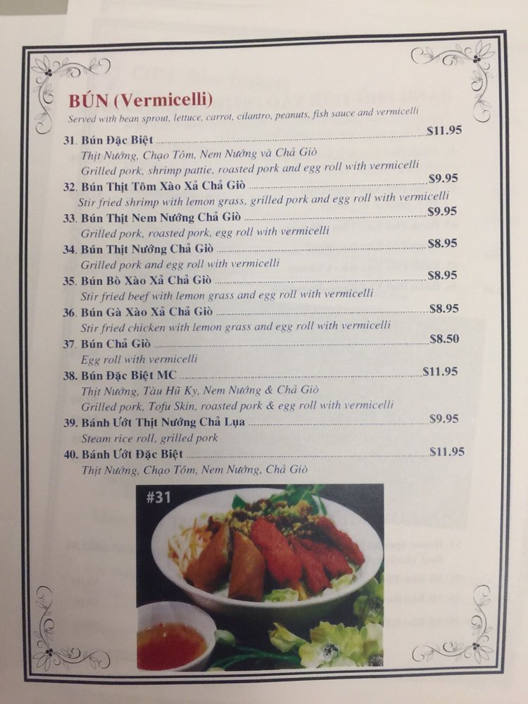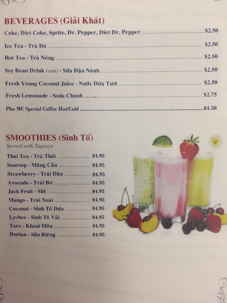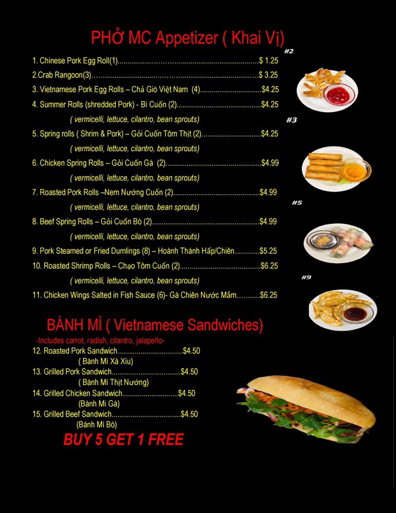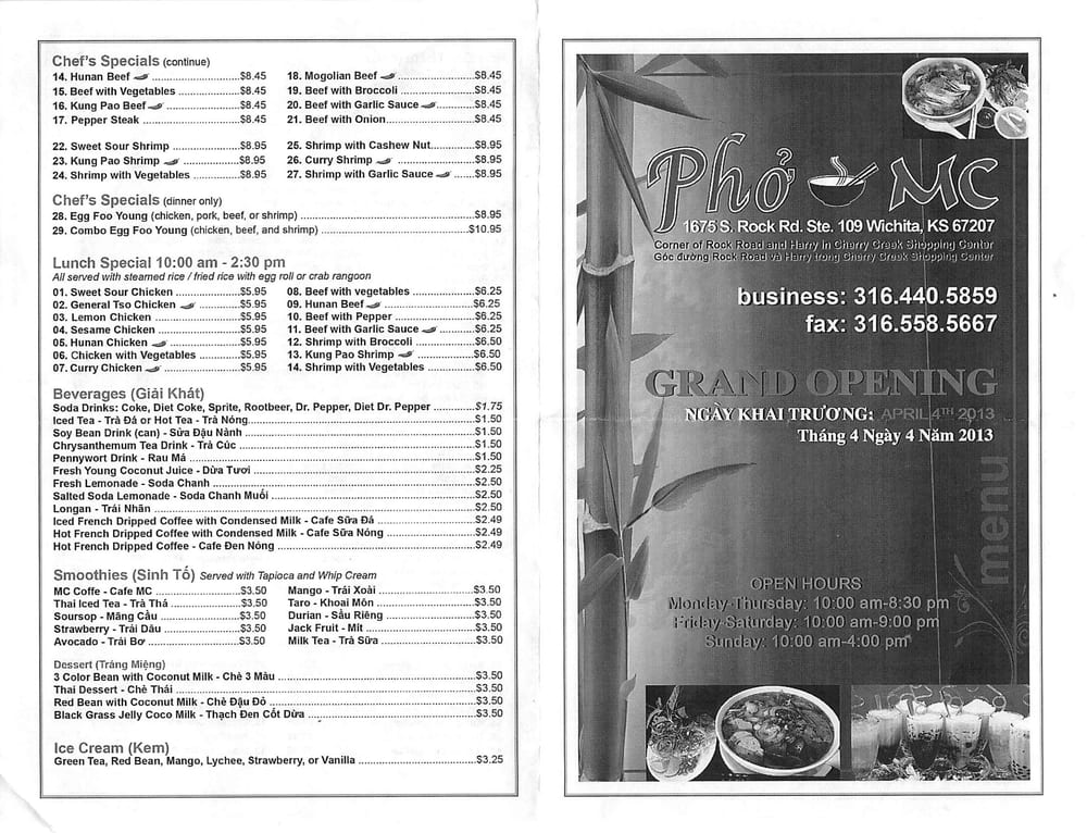 Welcome to Pho Mc, a Vietnamese restaurant located in Wichita, KS. This restaurant offers a variety of options for all preferences, including pescatarian and vegetarian dishes. The menu boasts a range of appetizers like French Fries, Crab Rangoon, and Pork Egg Rolls, as well as Banh Mi sandwiches and a selection of flavorful Pho dishes. Customers rave about the delicious food, with one reviewer specifically mentioning the beef lemongrass vermicelli and egg rolls. The friendly staff and reasonable prices make dining at Pho Mc a pleasant experience. Don't miss out on trying the mouth-watering fried rice, spring rolls, and General's chicken.Overall, Pho Mc is a must-visit for those craving authentic Vietnamese cuisine in a casual yet classy setting.